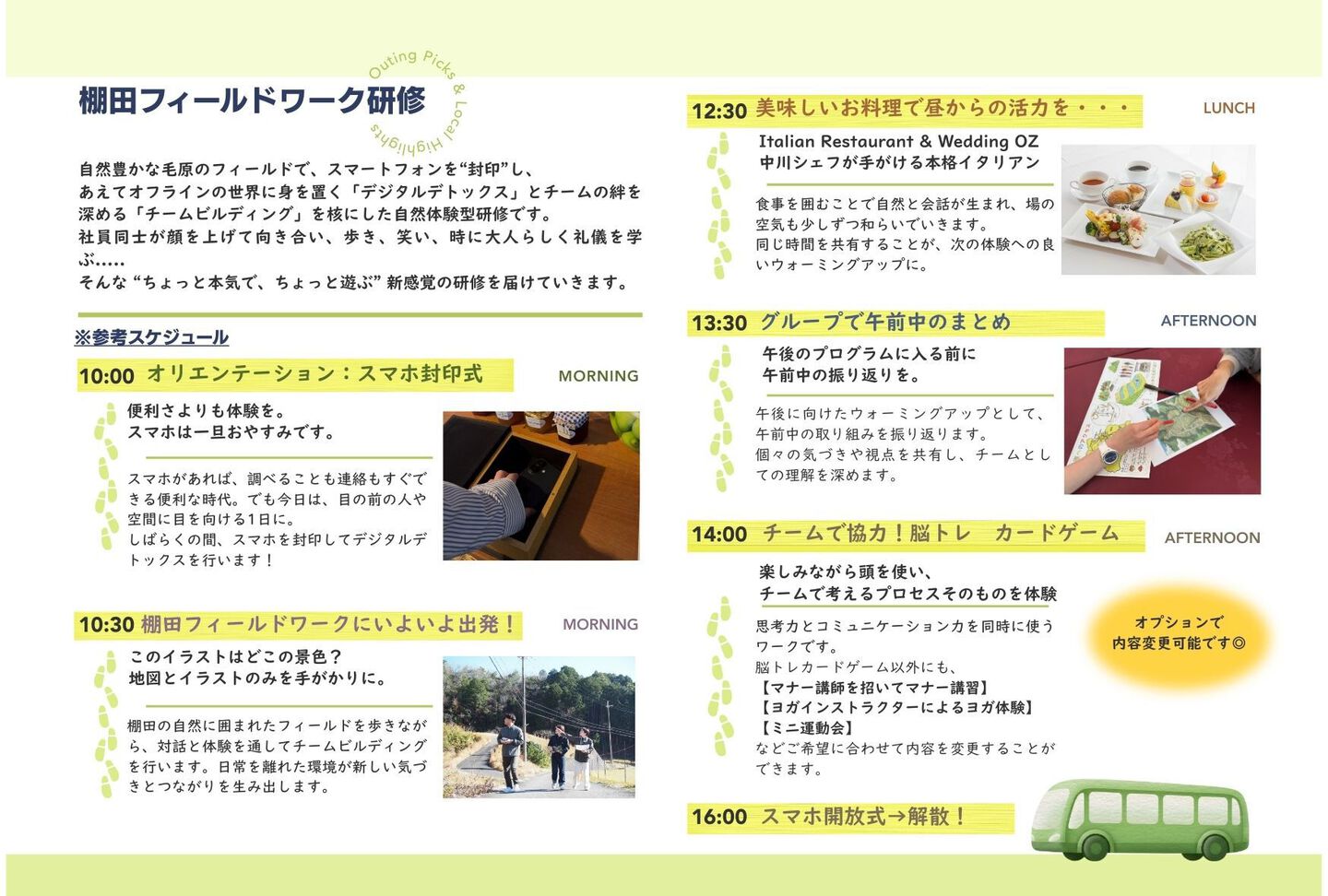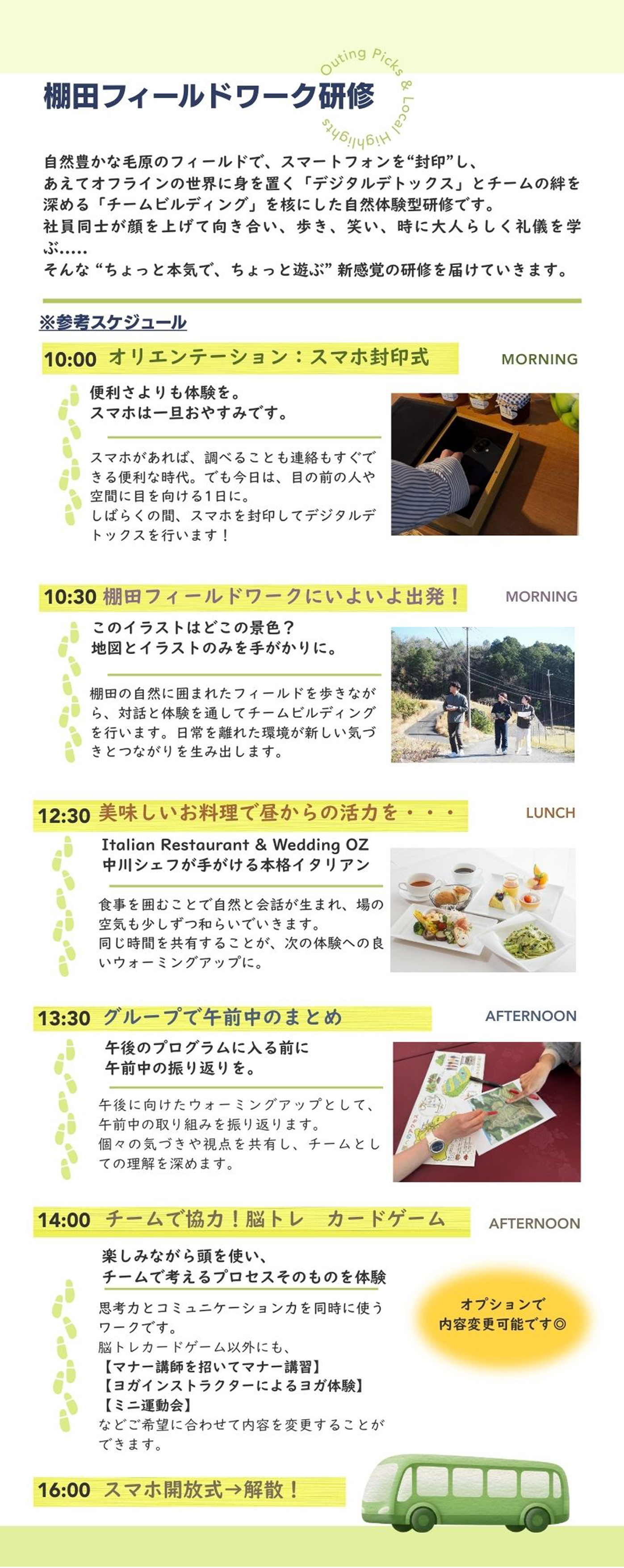 フィールドワークアイテム4グループ(地図+イラストセット+チェキ1台ずつ)→スマホ封印、フィールドワーク、振り返り・脳トレ(約1時間〜1時間半)→カードゲーム、脳トレ問題などお一人様追加1万円(税別)