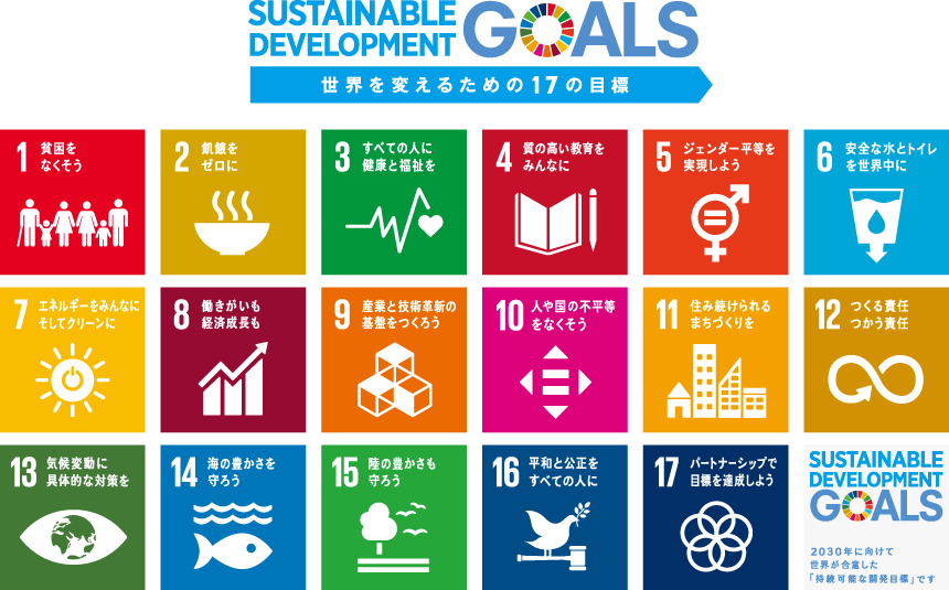 2015年9月に「国連持続可能な開発サミット」の成果文書として、「我々の世界を変革する:持続可能な開発のための2030アジェンダ」が採択されました。アジェンダは、人間、地球および繁栄のための行動計画として、宣言および目標を掲げました。この目標が、17の目標と169のターゲットからなる「持続可能な開発目標(SDGs)」です。今後のサステナビリティを考えるうえでの世界の共通言語として位置付けられるものといわれています。